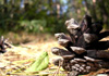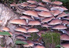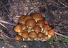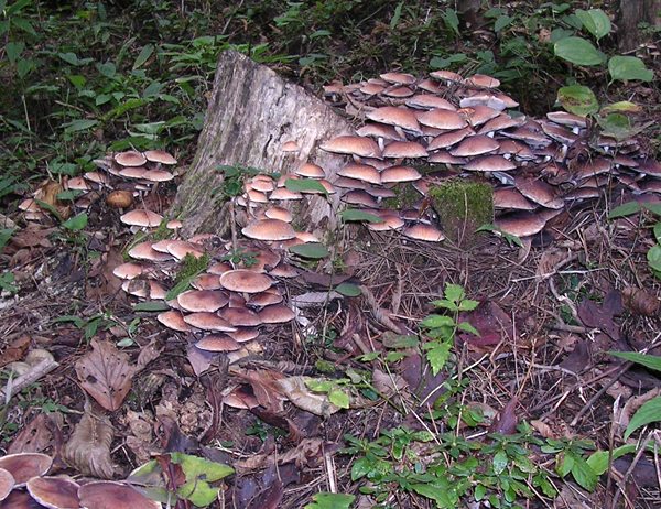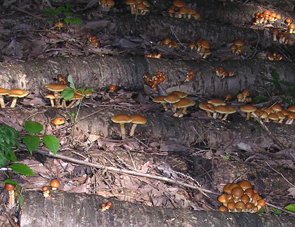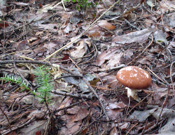 落ち葉の隙間からきのこたちが顔をのぞかせ、